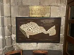 Like most pre-reformation churches in England the life of the laity at St Margaret's was focused on the parish guilds. At St Margaret's, the wealthiest of the two principle guilds was dedicated to the Blessed Virgin Mary and Katherine of Alexandria, like Margaret a virgin martyr and the patron of the nearby St Katherine's Priory perhaps suggesting an Augustinian connection.[9] Founded in 1355 it was probably a replacement to an older guild or guilds which died through reduction of membership during the plague. The purpose of the institution was provision for a good burial and proper chantry commemorations for its dead members, a mutual aid society for its living members, a social club, and a devotional religious society. Initially founded with the modest intention of finding two priests to say mass just twice a year for the souls of its departed members, the Guild of St Katherine soon grew wealthy enough to maintain an altar in the parish church (probably in the north aisle), a large communal guild hall on the east side of Church Gate, and two full time chaplains on a generous stipend of £10. 13s. 4d. per annum (roughly £3,000 today). At the time of the dissolution of guilds it had assets of £20. 10s. 1.5d. (roughly £5,600 today) and made a profit of nearly £7 per annum. When the guild was dissolved the land was divided between Edward Pease and James Wylson and part, at least, of the land to Robert Catlyn.[8] Today a remnant of the Guild of St Katherine is still visible in the church in the form of a large wooden chest bearing the distinctive wheel emblem of Katherine of Alexandria.[9]