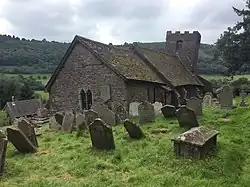 The church is constructed of Old Red Sandstone rubble with stone-tiled roofs.[1] The architectural style is Gothic and the building comprises a nave, chancel, porch and a three-storeyed tower with a castellated parapet.[1] The interior is slightly less altered than the exterior, the nave roof dating from the late 13th or early 14th centuries.[3] The unevenness of the structure remains very evident, however, the writer Simon Jenkins noting, "visitors might be on the deck of a galleon in a storm, with the chancel about to slide overboard".[7] The Monmouthshire writer and artist Fred Hando describes the church chancel as an example of a "weeping chancel", where the non-alignment of the nave and chancel axes was deliberate and was intended to represent the body of Christ in death, the nave standing for the body and the chancel standing for the head, fallen to the right.[8] The rood screen is a "remarkable work of craftsmanship".[7] The church's windows are 16th-century and the communion rails date to the 17th century.[3] A number of 18th- and 19th-century funeral monuments within the church were constructed by three generations of the Brute family of the distant village of Llanbedr, near Crickhowell, Powys.[3]