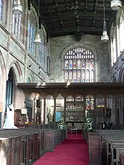 The nave and chancel are divided from the aisles by seven-bay arcades, the piers being without capitals. At the top of each pier, facing the nave, is a carved human face. The roofs are divided into panels and contain much carving, including bosses (protrusions), shields, inscriptions and three pendants.[4] The chapel at the west end of the south aisle is known as the Lady Chapel, and that on the north side is dedicated to Saint Mary.[1][4] The church contains more medieval fittings and furniture than any other Cheshire church.[2] Between the nave and the chancel is a screen, and there are parclose screens between the aisles and the chapels.[2] The chancel screen, dated 1500, is elaborately carved with representations of birds, roses, vines and foliage. It has ten bays with lierne vaulting. The chancel stalls and the carved wooden eagle lectern date from around the same period.[2] The lectern is one of the oldest eagle lecterns in the United Kingdom.[7] The stalls have hinged seats, and formerly had misericords (shelves to support a standing person).[4] Much of the furniture dates from the 17th century and is in Jacobean style. This includes the altar rails, the octagonal pulpit, the box pews, the reredos (screen behind the altar) in the Lady Chapel, and the font cover.[1][2] The font itself is Perpendicular.[4] The reredos in the chancel of 1866 was designed by the Manchester architect J. S. Crowther.[1]