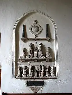The chancel arch is Perpendicular.[1] There is a simple Decorated 3 arch sedilia with columns, and a double-arched piscina from 1300 on the south side of the chancel.[1] Also on the south side of the chancel is an alabaster wall monument to Richard and Clemens Stone with kneeling figures, dating from 1607 but relocated to its present position in 1778.[1][2] There is also a brass to Henry of Nottingham and his wife in the chancel.[1]