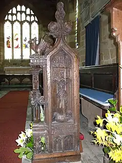 The church is built of stone, and has roofs of Welsh slate and lead. It consists of a nave with a clerestory, north and south aisles, a south porch, a chancel and a west tower. The tower is embraced by the aisles, and has three stages, a three-light west window with a pointed arch and a hood mould. In the top stage is a triple arcade, the central arch with a bell opening, and the outer arches blind, and above is a corbel table and a plain chamfered parapet. Inside, there is a 13th-century piscina, and a carving on an animal reset in the south wall, which is probably late 12th century. There are Jacobean benches, three stalls in the chancel dating from 1519, a 17th-century font cover, and a brass memorial to John Watson and his wife, from about 1530.[2][3][4]