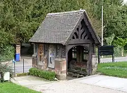 The lychgate at the northern entrance to the churchyard doubles as a war memorial and was erected by public subscription and a donation from the Mosley family in 1919. Designed by Lincolnshire architect Cecil Greenwood Hare and built in Lichfield, the structure contains a bronze crucifix and lists of those villagers killed during the two world wars.[5]: 17  The pierced side panels were replaced with new versions, in oak, in the 2000s.[5]: 22  The lychgate was granted protection as a grade II listed building on 26 March 1986.[12]
