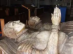 An alabaster tomb at the east end of the south aisle has well-detailed recumbent effigies of Thomas Acton of Sutton (died 1546) and his wife Mary (died 1564). Panels on the tomb have the images of their two sons Lancellot and Gabriell, who died in infancy, shown as kneeling youths; another panel shows their daughter and heir Joyce, who erected the tomb in 1581. She married the politician Thomas Lucy.[3][5]