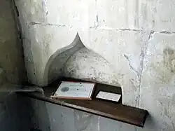 The chaplains at Battlefield initially had quarters in a three-story building next to the south side of the chancel and there are still visible remains of this.[41] Roger Philips acquired two parcels of land close to the south gate of the church and built three chambers on each to replace the old building. As he approached death in 1478 he settled these on the chaplains, on condition that they celebrate his anniversary on the Saturday after St Martin's Day (11 November) and pay 8d. annual rent to the Hussey family.[42] It is possible that a room in the church tower, which had a fireplace, also served as quarters for a resident priest.[43][44]