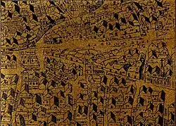 A section of the "woodcut" map of London of c.1561, showing St Mary Woollchurch Haw (marked "Q"), St Mary Woolnoth (marked with a reversed "P") and St Stephen's, Walbrook (marked "R").