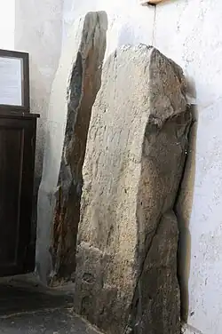 In the north west corner of the church will be found two ancient stones. One is the Calixtus Stone, placed in the Church in the 19th century and having been previously used as a footbridge on a neighbouring farm. The inscription has been read as: CAELIXTUS MONEDO REGI, and is thought to mean Calixtus King of Mona.[4]