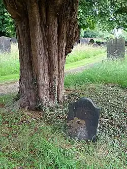 Colonel William Careless, who hid in the Royal Oak at Boscobel with Charles II, lies in an unmarked grave, towards the north west end of the churchyard.[5][7] Nearby, there is a small sandstone memorial which bears the inscription: "Near here lieth / the remains of / Col William Carless / whom the King did call / Carlos / he died May 28 1689." In the parish registers, his death is recorded: “Corinall William Carelesse, of Broumhall”.[3] Apparently, the grave was once marked by a tombstone that bore the name "Careless", but, by 1897, it had vanished. There is, on the west wall of the chancel, a commemorative plaque dedicated to William Careless.[4]