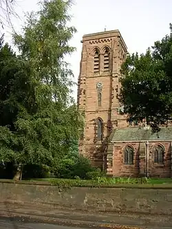 In the churchyard is a war memorial which consists of a stone cross, approximately 15 feet (5 m) high, on an octagonal base which was consecrated in 1923.[3] The churchyard also contains the war graves of three soldiers of World War I, and an airman of World War II.[6] The lych gate dates from 1889.[3] The cross on its roof was cut off in 1961 because of an infestation of death watch beetle.