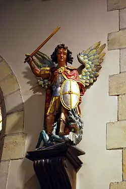 The church contains a 15th-century baptismal font with an 18th-century copper cover, a 17th-century statue of St Michael, two 18th-century confessionals, and an elaborately carved 19th-century pulpit.[1]