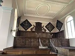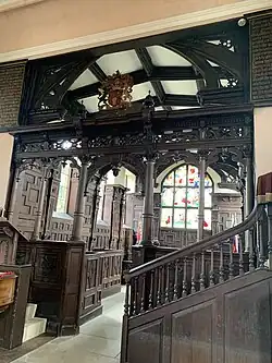 The hammerbeam roof includes both blank and openwork tracery. The authors of the Buildings of England series consider that the 17th-century furnishings of the chapel are the most complete of their date in Cheshire.[6] F. H. Crossley states that the chapel holds "the most valuable post-Reformation church furniture we possess in the country".[1] The chancel is panelled in old oak. The screen dividing the chancel from the nave is carved in Tudor style. The reading desk, pulpit, altar rails and holy table all date from the time of the Commonwealth. Extending across and elevated above the west end of the nave is the Cholmondeley family pew, with steps descending to the nave.[2] The stained glass includes many small Netherlandish roundels.[6][7]