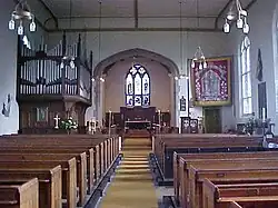The chancel was added in 1897 by G.B. Vialls[2] in a Gothic revival style, at a cost of £1200. The church then consisted of a chancel and nave with a west tower. There are vestries to the north and south sides of the chancel. The chancel has an open timber framed ceiling with plaster infill. The floor is of stone slabs with some wood block areas around the choir stalls. There is a decorative mosaic made from encaustic glass tiles on the altar platform.[1] At some point since its installation, the mosaic was covered with carpet, and forgotten about until it was rediscovered in 2008.[4]
