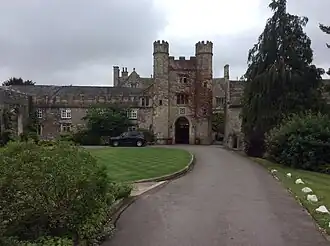 The mansion stands in very close proximity to the church of St Peter.[9] Built of sandstone rubble with Bath Stone dressings, most of the building dates from the mid 19th century or later.[3] The architectural historian John Newman describes the gatehouse as "the most impressive feature" of the mansion[9] and it, and the attached range, are almost the only remaining medieval work. The gatehouse is of three storeys, is constructed of local limestone and has "handsomely battlemented turrets".[9] The upper storeys of the attached range were reconstructed in the 19th century.[9] Newman notes that the house has undergone such significant alteration through its conversion to a hotel that "its historic character has been almost overwhelmed".[9] The gatehouse and range are listed Grade II*.[10] The gardens are listed at Grade II on the Cadw/ICOMOS Register of Parks and Gardens of Special Historic Interest in Wales.[11]