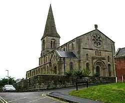 St Thomas' is built in sandstone with slate roofs, and is mainly in Romanesque Revival (Norman) style; all the openings are round-headed. The church consists of a six-bay nave with a clerestory, north and south aisles, and a chancel with a five-sided apse, which is flanked by north and south vestries. Above the chancel is a three-stage tower with a window on each side of the middle stage and two-light bell openings in the top stage.[5] Surmounting the tower is a broach spire.[1] In the lower part of the west front is a window in a Norman-style surround flanked by windows in two tiers. Above this is a three-light window, and in the gable is a wheel window. The wheel window is currently undertaking restoration work thanks to the funds raised by City Church Preston. There are doorways on each side of the church in the western bay of the aisles, the north doorway being gabled. The other bays along the sides of the aisles and the bays of the clerestory are divided by pilasters, and each contains a window. There is also a window in each side of the apse. Inside the church the arcades are carried on cylindrical piers. The interior of the church has been divided by the insertion of an upper floor.[5] Due to anti social behaviour, the ministry team reached out to local Architectural Assistant, Scott Hartley BSc, whilst he was studying architecture at the University of Central Lancashire. With the help of Hartley the City Church Preston team achieved planning permission for a perimeter fence to help protect the church. Few of the building's original windows survive, however, a window above where the old altar used to be, depicts Jesus Christ and is dated to 1907.