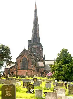 In the churchyard is a table tomb to the memory of William Worthington of Leftwich, a merchant who died in 1808, and members of his family. It is listed at Grade II.[9] Also listed Grade II is the lych gate which dates from the late 19th century,[10] and was designed by E. G. Paley.[11] Also in the churchyard is a memorial to the Russell Allen family, with dates including 1927, also by Lorimer.[7] The churchyard contains 18 war graves of British service personnel, 13  from World War I, and five from World War II.[12]