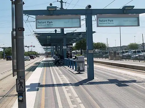 Stadium Park/Astrodome is an island platformed METRORail light rail station in Houston, Texas, United States. The station was opened on January 1, 2004, originally as Reliant Park station,[1] and is operated by the Metropolitan Transit Authority of Harris County, Texas (METRO). The station is located at the intersection of Fannin Street and Holly Hall Street, next to NRG Park. This station is decorated with various photographs from The Astrodome's history including the Rodeo, the Houston Astros and an Elvis concert.