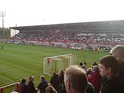 Falkirk were denied promotion in 2000 (Aberdeen being spared possible relegation in a play-off)[21] and 2003 (Motherwell reprieved)[22] due to the condition of Brockville Park before they sold the town centre site for the construction of a supermarket (as Airdrie and Hamilton had done), sharing with Stenhousemuir for one year while their new stadium on the edge of town was being built. The Bairns were angered when Inverness Caledonian Thistle, who already had a new stadium but not of sufficient size, were allowed to join the SPL for the 2004–05 campaign on a ground-sharing agreement with Aberdeen[23] (100 miles away from their home city), albeit only for six months during expansion work, when Falkirk had been denied such an arrangement with Clyde or Airdrie United the year before.[24] This development caused further annoyance for Partick Thistle as they were the club relegated from the top division when Inverness made their Aberdeen plan.[11] That summer, a reduction in the required seating capacity from 10,000 to 6,000 came into effect[25] which benefitted clubs such Inverness,[26] Falkirk (who gained promotion in the first season in their new stadium) and later Hamilton, as smaller new venues were now acceptable without even having all four sides built up (to reach the lower threshold in 2008, Hamilton erected a 'temporary' stand for 700 which was still in place a decade later).
