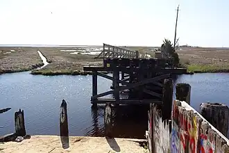 While growing quickly, development was still sparse. Route 72 was still mostly wooded, aside from several car dealerships, gas stations, a drive-in movie theater, and the Manahawkin Executive Airport. The pace of development increased during the 1980s with new residential projects, including the expansion of Beach Haven West and Ocean Acres, transforming the area from seasonal vacation homes to year-round residences. This period also saw the establishment of Stafford Square, the township's first major shopping center. The Manahawkin Airport closed in the early 1990s to make way for commercial developments, including a Walmart and Pathmark.[23] However, part of the runway was left intact until the 2000s, when the St. Mary's of the Pines Catholic Church and All Saints Regional Catholic School were built on the land.[24]