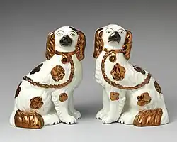 Staffordshire dog figurines are matching pairs of pottery spaniel dogs, standing guard, which were habitually placed on mantelpieces in 19th-century homes. Mainly manufactured in Staffordshire pottery, these earthenware figures were also made in other English counties and in Scotland. They are also known as hearth spaniels or fireplace dogs as they were positioned on top of the mantelpiece.[1][2][3] Many other breeds were produced, particularly the greyhound, though the spaniels were especially popular and this is attributed to royalty favouring the King Charles Spaniel breed. In Scotland, they were colloquially termed Wally dugs[Note 1][4] and were manufactured in bulk at potteries in places such as Pollokshaws in Glasgow and Portobello near Edinburgh.[8][9]