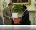 His excellency Stanislas Batchi Busanzi, ambassador from Republic of the Congo in USA présenting credentials letters to president Ronald Reagan in November 1985