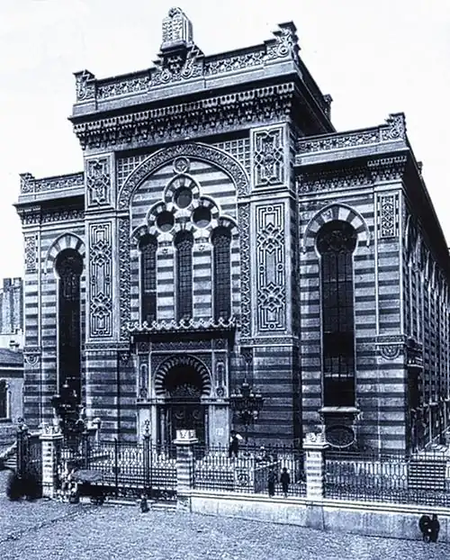 The 1861 building was replaced between 1897 and 1900 by an elaborate Moorish Revival style synagogue designed by Adolf Zeligson, a well-known Łódź architect. The architect's signed plans for the building were auctioned at Sotheby's on 17 December 2008, for $13,750.[3]