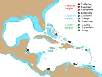 | Distribution of species in the S. atlantica, S. lepicoelia, and S. sluiteri groups. Circles show locations for genetically analyzed specimens.[1] | |