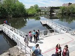 Current recreational facilities in Starlight Park include four baseball fields (two made of grass and two of asphalt), as well as five checkers tables and eight handball courts.[29] A soccer field overlaps with two of the baseball fields, and a basketball court and playground are located south of the 174th Street bridge over the park.[45] A seasonal canoe launch is located in the park as well.[46] During the summer, the Bronx River Alliance operates a canoeing program called Community Paddle; the program charges a fee on Saturdays but is free on Fridays.[42] Plans for the park, announced in 2017, call for a waterfront greenway, as well as the opening of the parkland on the eastern bank of the Bronx River.[33]