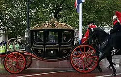 Depending on the area where the ceremony takes place, there will be a march past immediately after the inspection. If it takes place on Horse Guards Parade, then the foreign guest and the King travel to Buckingham Palace in a carriage procession escorted by a large number of mounted soldiers from the Household Cavalry. The welcome ceremony is accompanied by 21-gun salutes fired from Green Park and the Tower of London.[3][4] Exceptions to this included Chinese leader Xi Jinping who was received with a 41-gun salute in Green Park and a simultaneous 62-gun salute at the Tower of London and City of London (103 guns in total).[5][6][7][8]