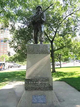 A 20-foot (6.1 m) bronze statue of decorated World War II soldier Joe P. Martínez is installed outside the Colorado State Capitol, in Denver.[1]