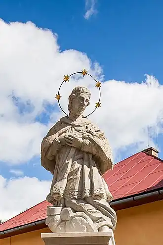 The statue of St. John of Nepomuk in Divina is a National Cultural Monument of Slovakia. Divina is a village and municipality in Žilina District in the Žilina Region of northern Slovakia. In historical records the village was first mentioned in 1325. The Statue of St. John of Nepomuk is registered in the Central List of the Slovak Memorial Fund under the number 1334/2.[1] It is a sandstone sculpture from 1796 standing on a stone base. The statue has a good artistic elaboration of the saint's face and drapery. The saint does not have a traditional biretta on his head. The statue is a remembrance of the last male descendant of the aristocratic Szunyogh family – John Nepomuk Szunyogh, who is credited with the construction of the Divina church and rectory. In Slovakia, there are only few preserved architectural and artistic monuments that belonged to the count branch of the Szunyog family of Budatín. In 1588, the branch was promoted to barons, later counts. The last male descendant was John Nepomuk Szunyogh, who died in 1798, leaving only one daughter Josephine. St. John of Nepomuk was his personal patron, to whom he had a special reverence.
