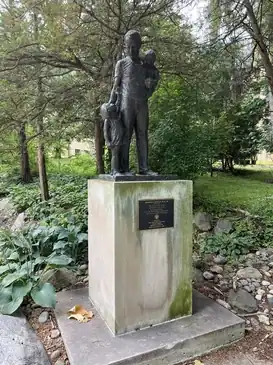 The statue of Thomas Anthony Dooley III with Lao children[1] is installed near the Grotto of Our Lady of Lourdes, Notre Dame.[2][3] The bronze sculpture measures approximately 4 ft. 3 in. x 2 ft. 2 in. x 1 ft. 6 in., and rests on a concrete base that measures approximately 4 ft. 6 in. x 5 ft. 1 in. x 4 ft. 6 in. A plaque reads: "THOMAS A. DOOLEY, M.D. '48 / 1927-1961 / Who as a pre-medical student / cherished Our Lady's Grotto / and who as a physician served the afflicted people of Southeast Asia / with uncommon devotion and dedication / Gift of the / Notre Dame Club of St. Louis / and the sculptor / Rudolph E. Torrini '59 / Dedicated February 1, 1986".[4]