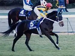 In October, he took on two of Japan's best thoroughbreds, T M Opera O and Narita Top Road, in the Kyoto Daishoten and defeated them. However, during the race he cut off Narita Top Road, injuring both the horse and his jockey, and leading to his disqualification from the race.[1][2]
