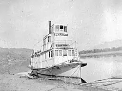 Another competitor was Captain Tom Powers, of Tobacco Plain, Montana who traded 15 cayuse horses for the machinery to build a small steamer near Fort Steele, which was called Fool Hen.[21] The machinery was too large for Fool Hen and there was no room for freight. Powers used discarded wooden packing cases from Libby merchants to make his paddlewheel buckets, so that as the steamer churned down the river, the merchants' names rotated again and again as the wheel turned. Shortly after Fool Hen was finished, Powers then removed the engines and placed them in a new steamer, the Libby. This time the engines proved to be too small for the hull, and Libby was used only sporadically in 1894 and 1895.[1][18]