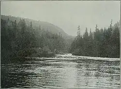 The Steel River was likely used as a minor supply or fur-trading route in the 19th century. One indigenous burial site has been found along the river. It was first advertised as a canoeing destination in the 1890s by the Canadian Pacific Railway, that crosses the river near its mouth.[3] The Steel River can be paddled as a circular loop via a 1 km-long (0.62 mi) portage (albeit with a strenuous 350 m (1,150 ft) climb) from Santoy Lake to Diablo Lake and on to Cairngorm Lake.[4]