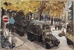 In December 1941, Schmolle applied to join the Art Department of the Ministry of Information but was not accepted. However the War Artists' Advisory Committee, WAAC, of the same Ministry agreed to assist her in obtaining materials to continue working as an artist during the Second World War. In 1942, Schmolle was conscripted into the Auxiliary Territorial Service, ATS, and initially did camouflage work before becoming an draughtswomen to an ATS intelligence officer.[2] She served with the ATS in both Britain and, following the D-Day landings in 1944, also France and Belgium.[4] During this period she continued to paint. Her subjects included scenes showing French collaborators in Normandy, British troops clearing an SS headquarters in Brussels and both ATS and civilian activities in Britain.[5] Eventually seventeen of these pictures were purchased by the War Artists Advisory Committee.