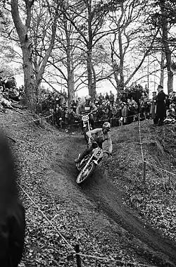 The Motocross World Championships of the early 1960s marked the beginning of a period of Swedish domination as five of the top six competitors in the 1960 500cc World Championship were from Sweden with only fourth-placed British rider Don Rickman (Triumph) breaking up the Swedish monopoly.[18] Lundin and Nilsson (Husqvarna) would engage in a season long battle for the 1960 500cc World Championship.[18] Nilsson won four Grand Prix races while Lundin won three as Nilsson claimed his second World Championship by just two points.[18][19]