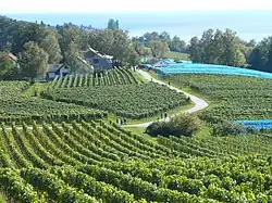View from German war cemetery Meersburg-Lerchenberg, Germany, to wineyard Aufricht and the part of Stetten at the shore of Bodensee
