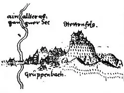 Stettenfels Castle above Gruppenbach on a map from 1598