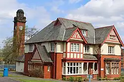 During the First World War, the building was requisitioned by the War Office to create the 3rd and 4th Scottish General Hospitals, facilities for the Royal Army Medical Corps to treat military casualties.[4] Wounded servicemen arrived by specially converted hospital trains that terminated at a temporary railway platform built within the hospital grounds.[5] A staff of 240 Territorial Force nurses as well as volunteers from the St. Andrew's Ambulance Association cared for over 1,000 patients at a time, suffering from battlefield wounds to venereal disease, until the return of the hospital to civilian use in early 1920.[6]