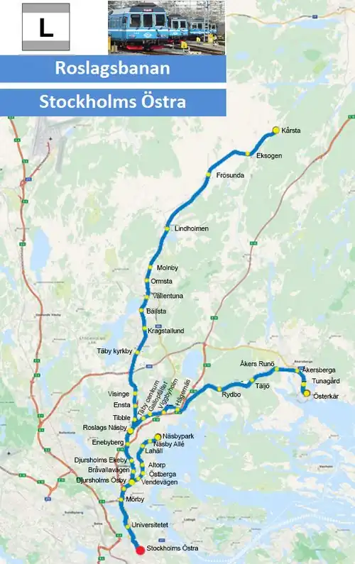 2. ^ "Banguide - Roslagsbanan Stockholms Östra-Kårsta, Djursholms Ösby-Näsbypark, Roslags Näsby-Österskär - järnväg.net". www.jarnvag.net. Retrieved 2024-11-29.