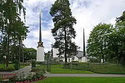 The temple sits on a 4.47-acre (1.81 ha) lot with six spires rising above the pines of the nearby forest. A cobblestone path leads to its doors.[1] Prior to its current, major reconstruction, the temple had a total of 16,366 square feet (1,520.5 m2),[1] four ordinance rooms, and three sealing rooms. The temple serves Latter-day Saints from the countries of Sweden, Norway, and Latvia.