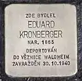 Eduard Kronberger was born on 30 July 1865 in Soběslav. He was one of ten children of Seligmann Kronberger (1830–1886) und Franziska geb. Rind (around 1835 in Přehořov – 1887 in Soběslav). He moved to Chodov, became a merchant and married Jenny née Löwy (born on 10 February 1875). The couple had five children: sons Walter (born 1896) and Oskar (born 1899) as well as daughters Franziska (born on 20. März 1898 in Chodov), Erna (born 1903) and Frieda. His wife died on 25 March 1929 in Chodov. After the Germans invaded, he was arrested and interned at the prison of Waldheim, Saxony. He was murdered by the Nazi regime on 30 October 1940.[6][7]