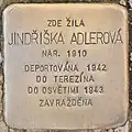 Jindřiška Adlerová was born on 9 June 1910. Her parents were Jakub Adler and Růžena née Fröhlichová. She had an older sister, Anna (born 1906), and three brothers, Josef (born 1904), Ota (born 1908) and Jaroslav. At a certain period she lived in Prague II, Vladislavova 16. She, her mother and her brother Ota were deported on 26 November 1942 from Klatovy to Theresienstadt concentration camp by transport Cd. Her transport number was 171 of 651. On 23 January 1943, she was deported to Auschwitz concentration camp by transport Cr. Her transport number was 1048 of 2,017. She was murdered there.[5][6]