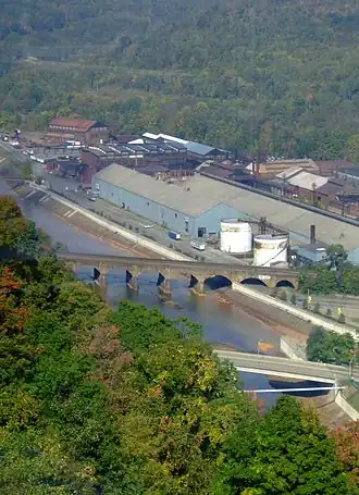 The Stone Bridge spans the Conemaugh River in Johnstown, Pennsylvania. The bridge is a seven-arch stone railroad bridge located on the Norfolk Southern Railway's Pittsburgh Line, built by the Pennsylvania Railroad in 1887–88. Its upstream face was reinforced with concrete in 1929.[1]