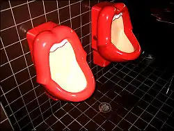 Within a year after the opening, the urinals, designed by the female Dutch artist Meike van Schijndel, where subject to controversy when feminists judged them to be sexist. The urinals have the shape of red lips and are inspired by the logo of The Rolling Stones. Back in 1971, the logo was inspired by the mouth of Mick Jagger. In this design, the tongue is left out, which gives a mere womanly look. Founder Ulli Schröder replied to the controversy with: "That's not a man's mouth or a woman's mouth, that's art. They were damned expensive and they're staying where they are and that’s final."[4]