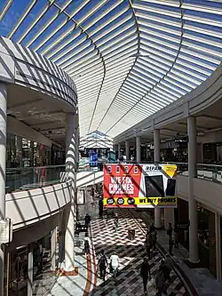 Currently, the mall's anchor stores are Target and a Regal Cinemas. The anchor store spaces are each two stories, but most in-line stores are one story. The hallways form a plus shape, with the former Macy's on the north side, and Target, Trader Joe's, Chase, Shake Shack and Bank of America, on the south side. There are four wings, two on level one and two on level two, with a food court on the center upper level.[2] Marble columns and skylights follow the wings of the mall as staples of its architecture. A demolition/rebuilding project in the late 1980s added many of the current architectural features.[3] The former Macy's anchor space was demolished in 2019 and renovated, as it now houses a Regal Cinemas, Whole Foods Market, and Sports Basement, a California chain of sporting goods stores. Brookfield Properties, the owners and managers of the mall, announced in 2021 their plans to further renovate the mall into a 'town center' under their Stonestown Reimagined vision.[4]