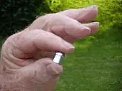 A member of a stopper club presents his stopper. In this specific case, the stopper is a custom-made approximately cylindrical object machined from metal, but stoppers made of cork or rubber are often used by other clubs.