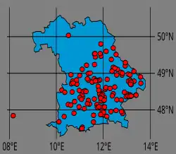 Towns in which a local stopper club is recorded. In the background, the German state of Bavaria is highlighted, since nearly all stopper clubs in this state.