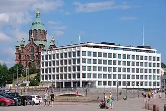 The building is located in a prominent position by the city's central South Harbour (Finnish: Eteläsatama) and Market Square, adjacent to the Presidential Palace.[3][2][4] It is considered by some an eyesore for the way it seems to clash[5] with the neoclassical architecture of its immediate surroundings and the Uspenski Cathedral, and is regarded as one of the most controversial of Aalto's designs.[3][4] It has at times been called "the ugliest building in Finland",[7] the "most hated building" and "completely misplaced".[5] Also construction of the building originally required the demolition of the palace-like Norrmén house designed by Theodor Höijer, which was criticised right from the start.[8]