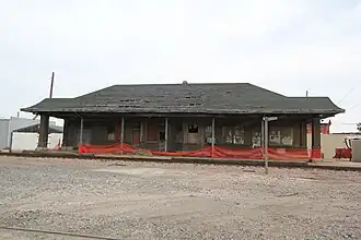 Storm Lake station was a former building located in Storm Lake, Iowa, United States. The Iowa Falls & Sioux City Railroad, an Illinois Central Railroad (IC) subsidiary, built the first tracks through town in 1870. They also built a two-story frame combination freight and passenger depot the same year. The present depot is a second generation IC structure built of brick. The building's architectural style is Prairie School with Tudor Revival elements in the dormer and canopy ends. It was designed by IC architect E.E. Bihl, and it is similar to the railroad's depots in Flossmoor, Illinois and Fort Dodge, Iowa.[2] The new passenger depot was completed in August, 1915, and the old depot was re-purposed for a dedicated freight depot. It was torn down sometime before 1948. Passenger service remained high during the 1910s and 1920s, with the decline accelerating after World War II, and it ended all together in the late 1960s. While freight trains continue to use the IC's tracks, the depot has been abandoned. It was listed on the National Register of Historic Places in 1990.[1] The Storm Lake Illinois Central depot was demolished on February 25, 2013.