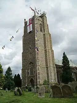 A post-medieval source states that the prominent medieval philosopher Robert Grosseteste, also Bishop of Lincoln, was born in Stradbroke in about 1175, but there is no medieval evidence to confirm this. Its parish church of All Saints, with a 15th-century tower and a raised stair turret, dominates the village as a landmark.[4] Most of the church is in the perpendicular style, including the tower and nave, with 15th-century flint flushwork on the battlements, highlighting the village's wealth at the time.[5]